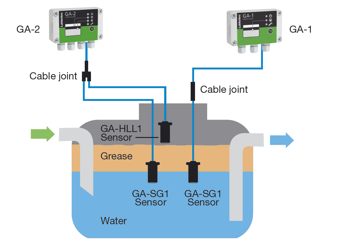 The system package includes the GA-2 control unit, GA-SG1 grease alarm sensor, GA-HLL1 blockage sensor, and a cable joint.